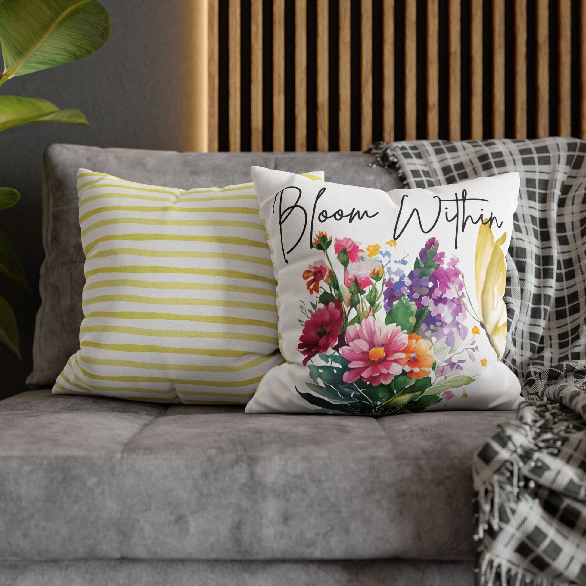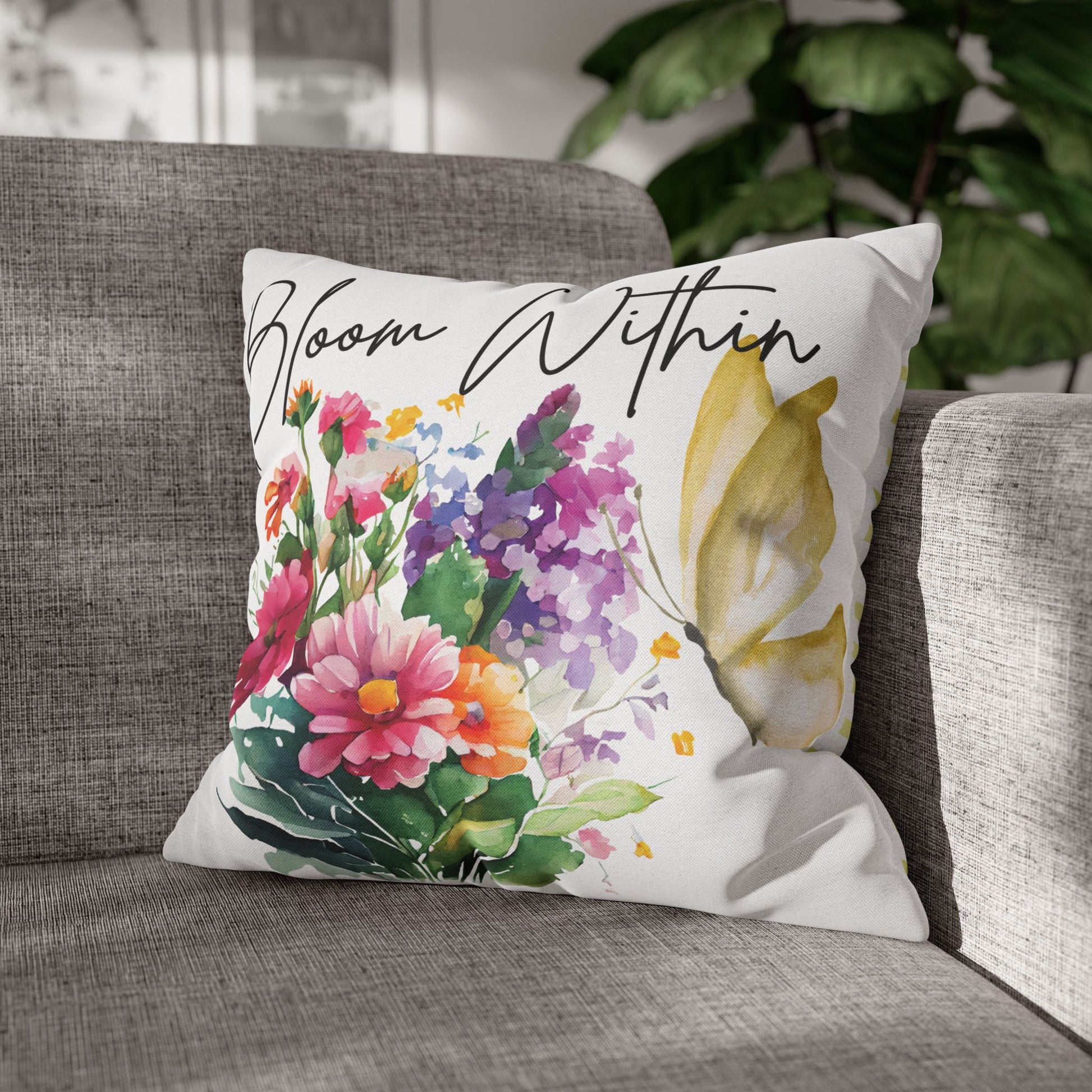 Bring beauty and intention into your space with this Bloom Within throw pillow. Featuring a vivid watercolor bouquet and a soft yellow butterfly beside the empowering words “Bloom Within,” this cushion cover adds both color and meaning to your home decor. It’s perfect for cozy corners, reading nooks, and uplifting vibes.