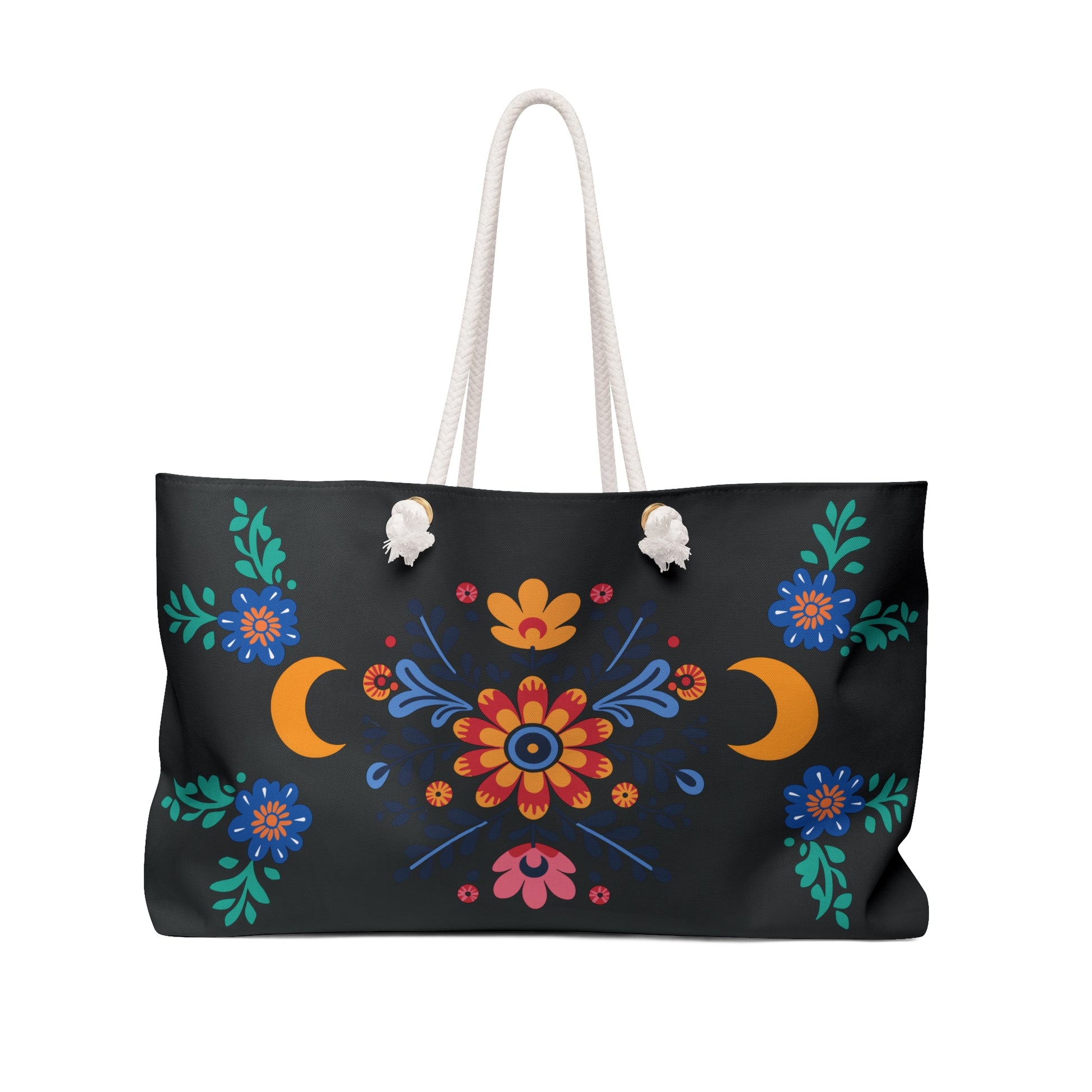 Celestial Bloom Weekender Bag – Boho Moon & Floral Travel Tote | Mystical Folk Art Carryall | Stardust Cove