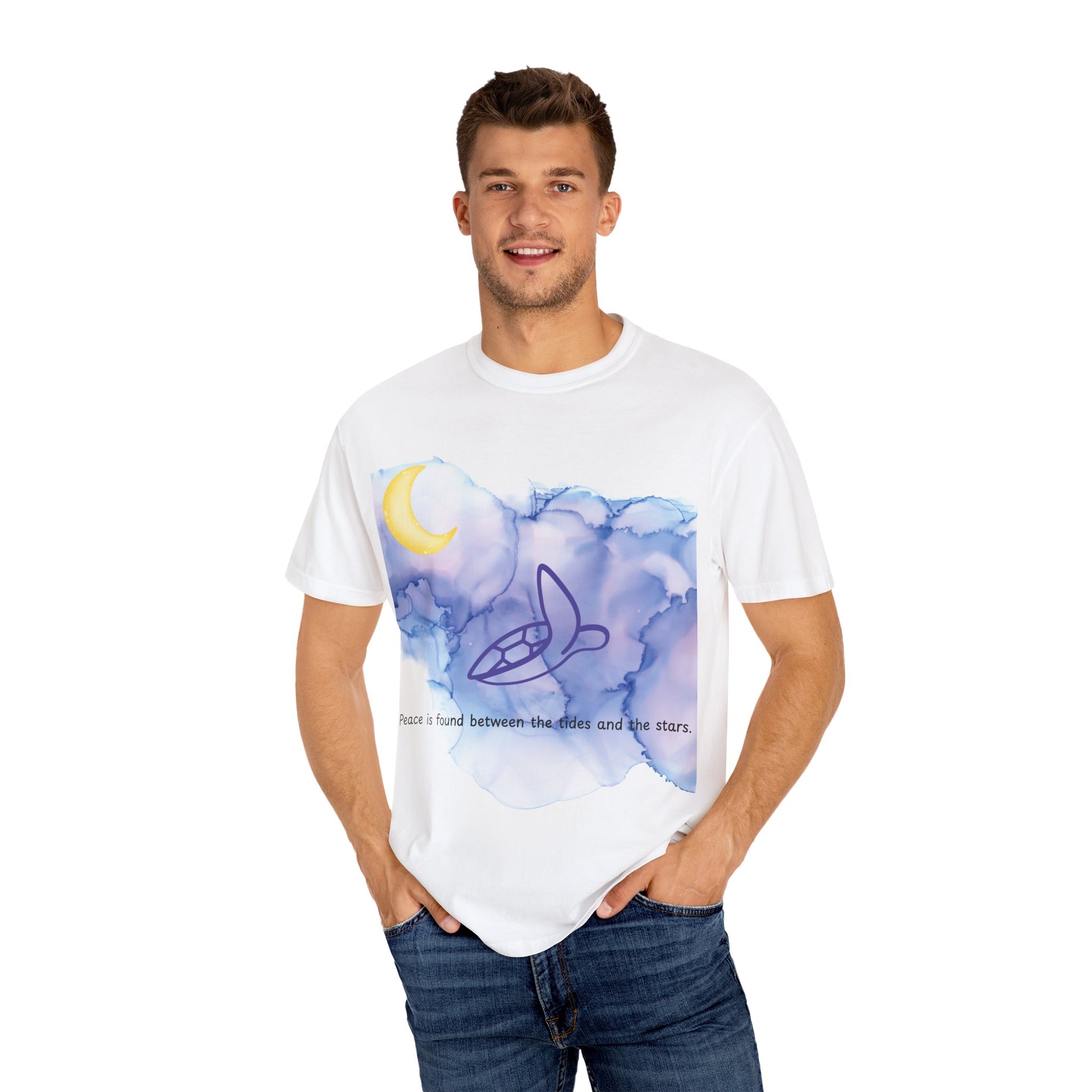Move with peace and purpose in our Celestial Sea Turtle T-Shirt from Stardust Cove. This minimalist design features a graceful line-art sea turtle floating across a dreamy watercolor ocean, with a soft crescent moon watching overhead. It's the perfect tee for ocean lovers, moon children, and slow-living souls who find magic in the in-between.