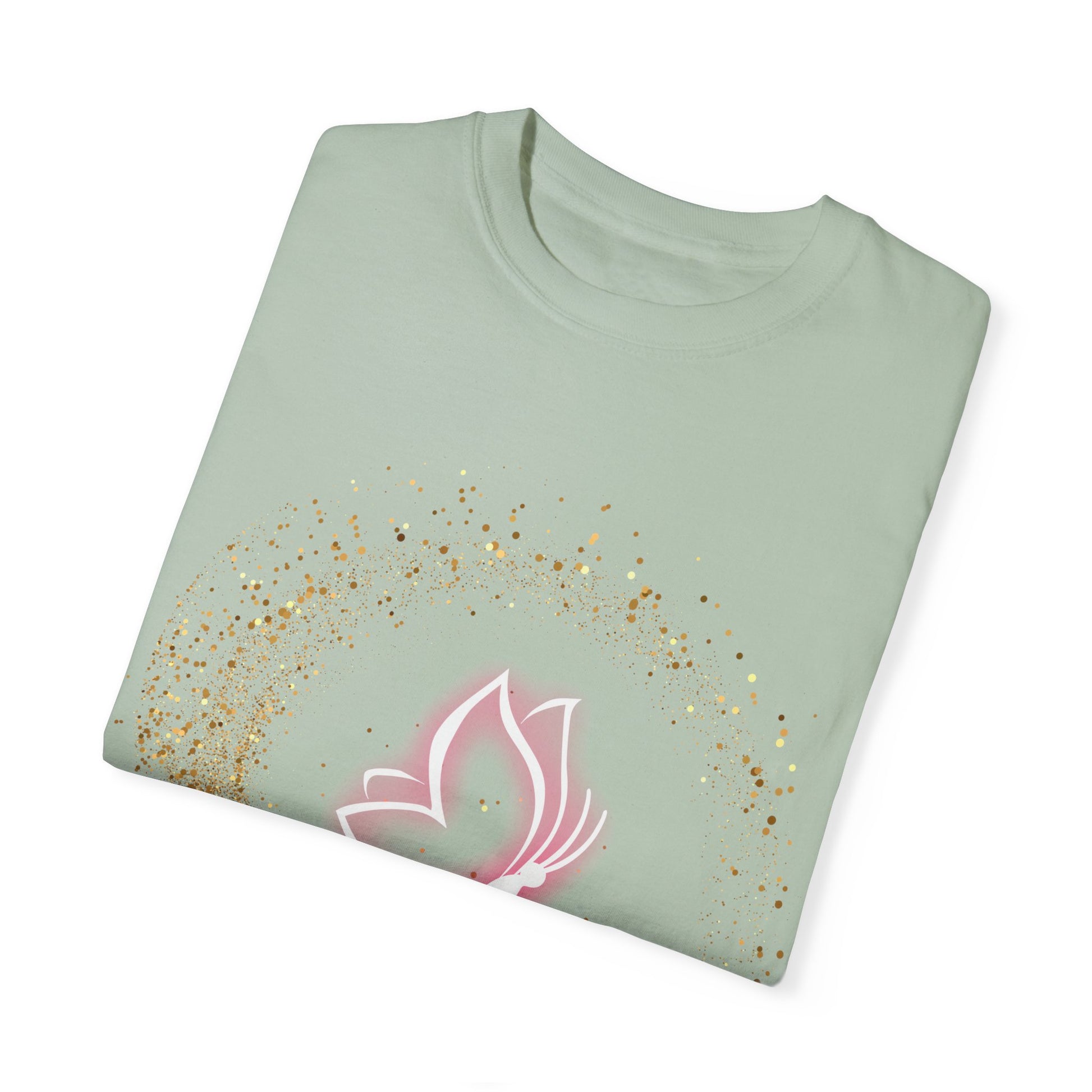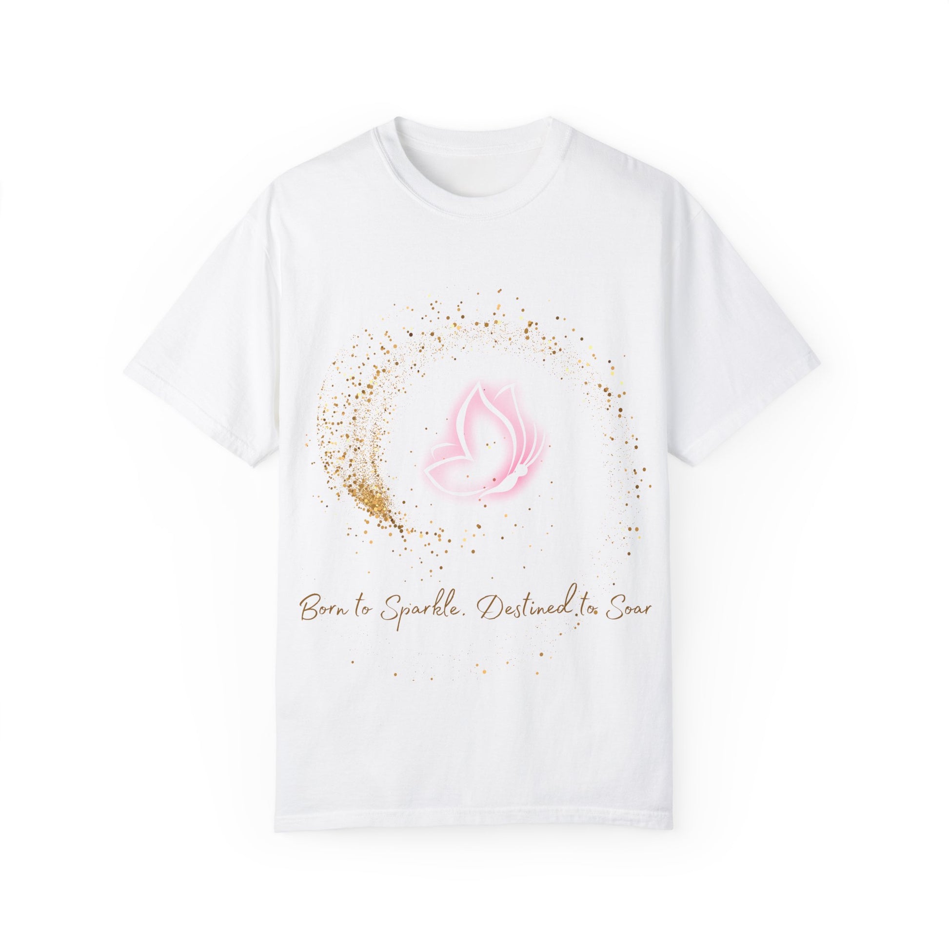 Embrace your inner light with our "Born to Sparkle, Destined to Soar" inspirational t-shirt. Featuring a graceful pink butterfly surrounded by shimmering gold accents, this soft mint green tee is a reminder that you were made to shine and rise above. Perfect for dreamers, achievers, and anyone who believes in their journey. Lightweight, comfortable, and filled with positivity — wear it to inspire yourself and others every day.