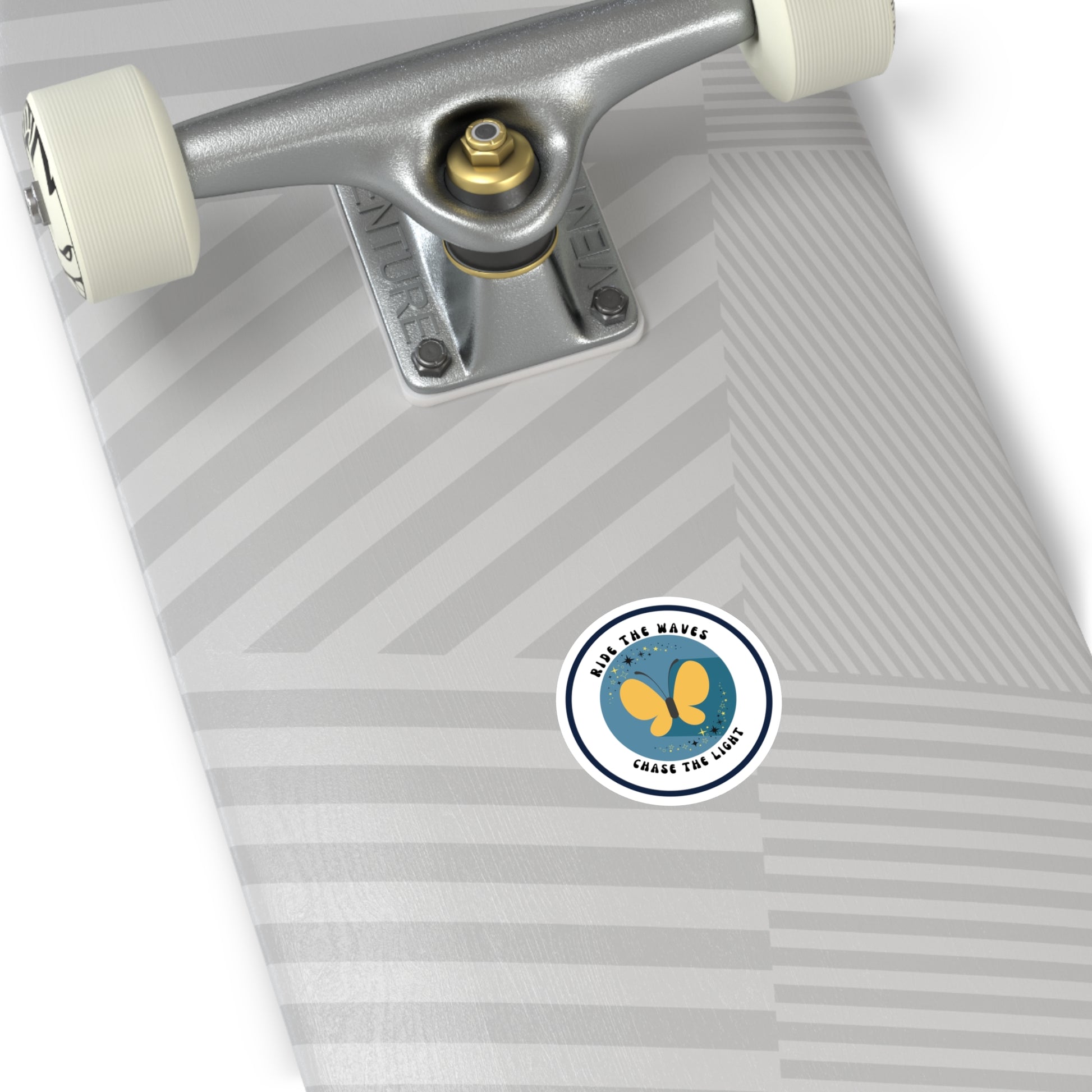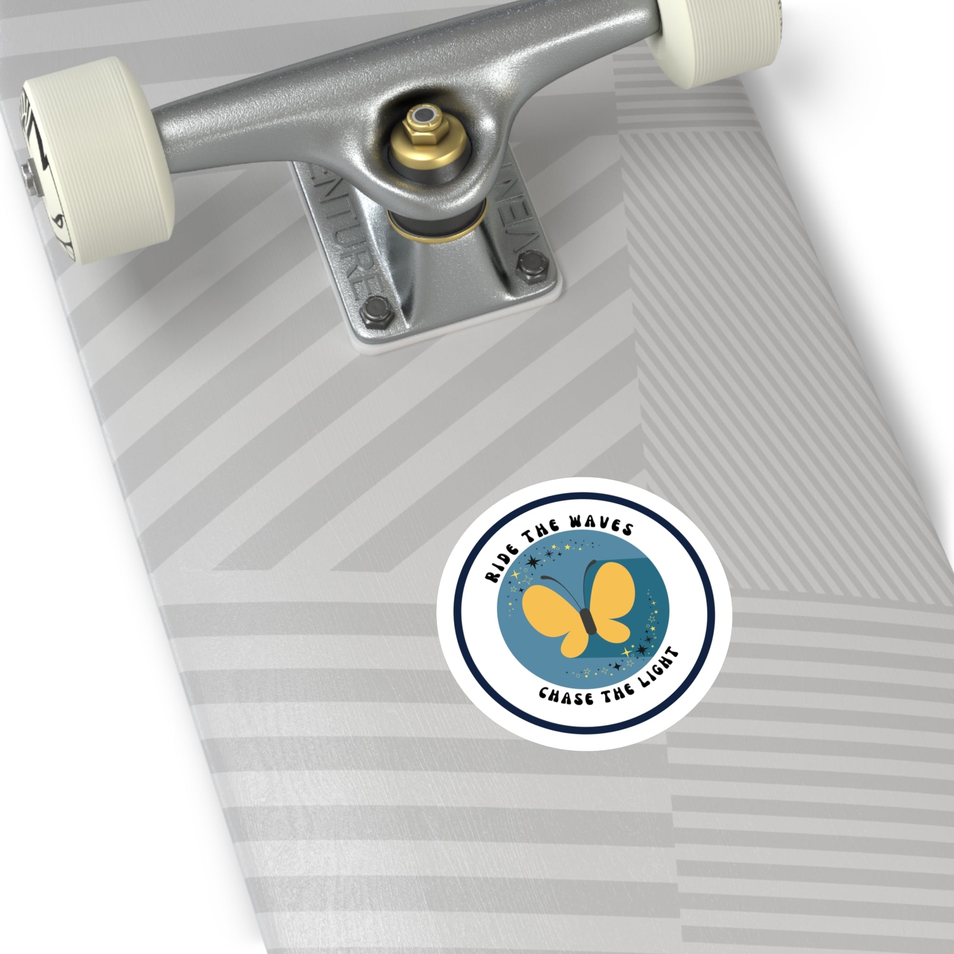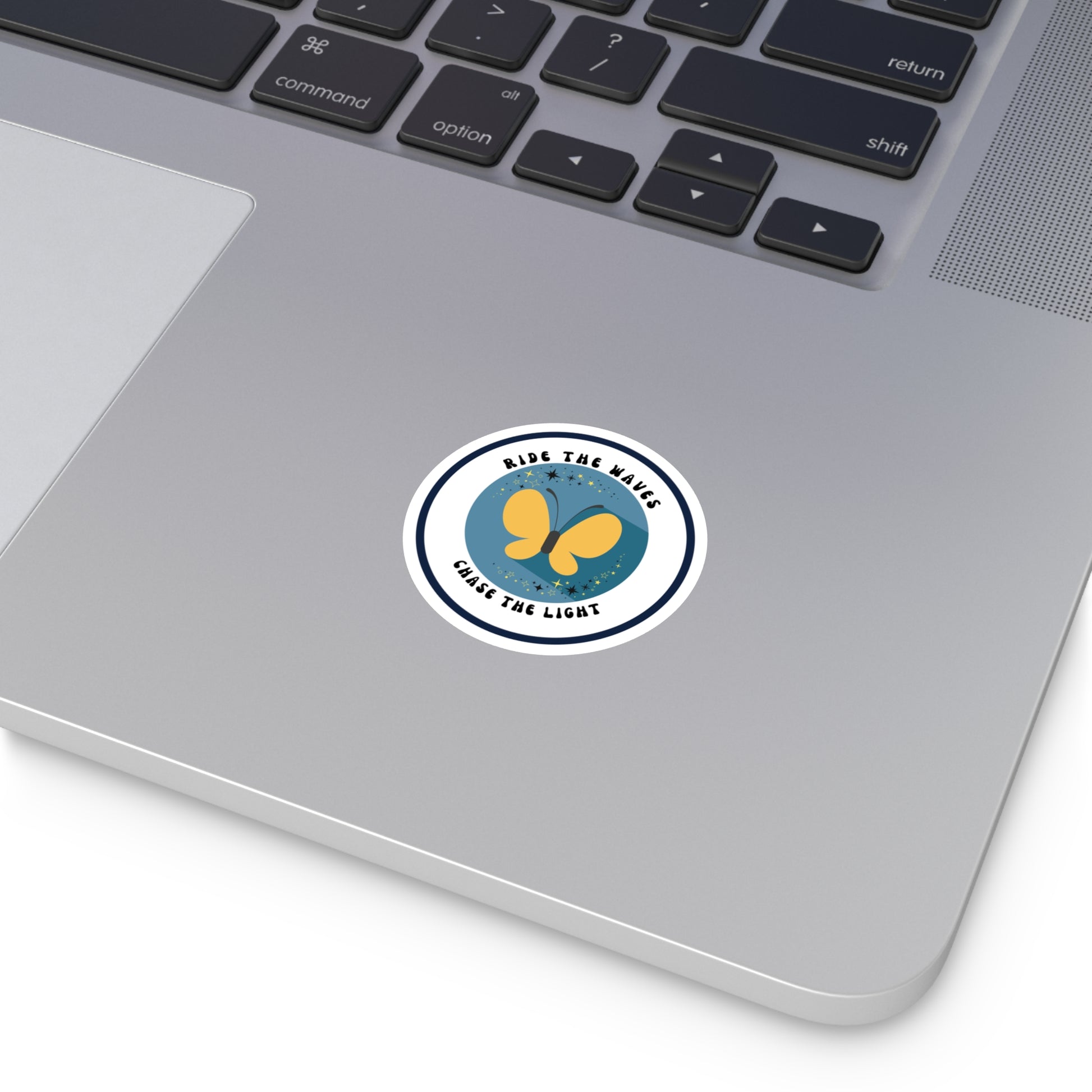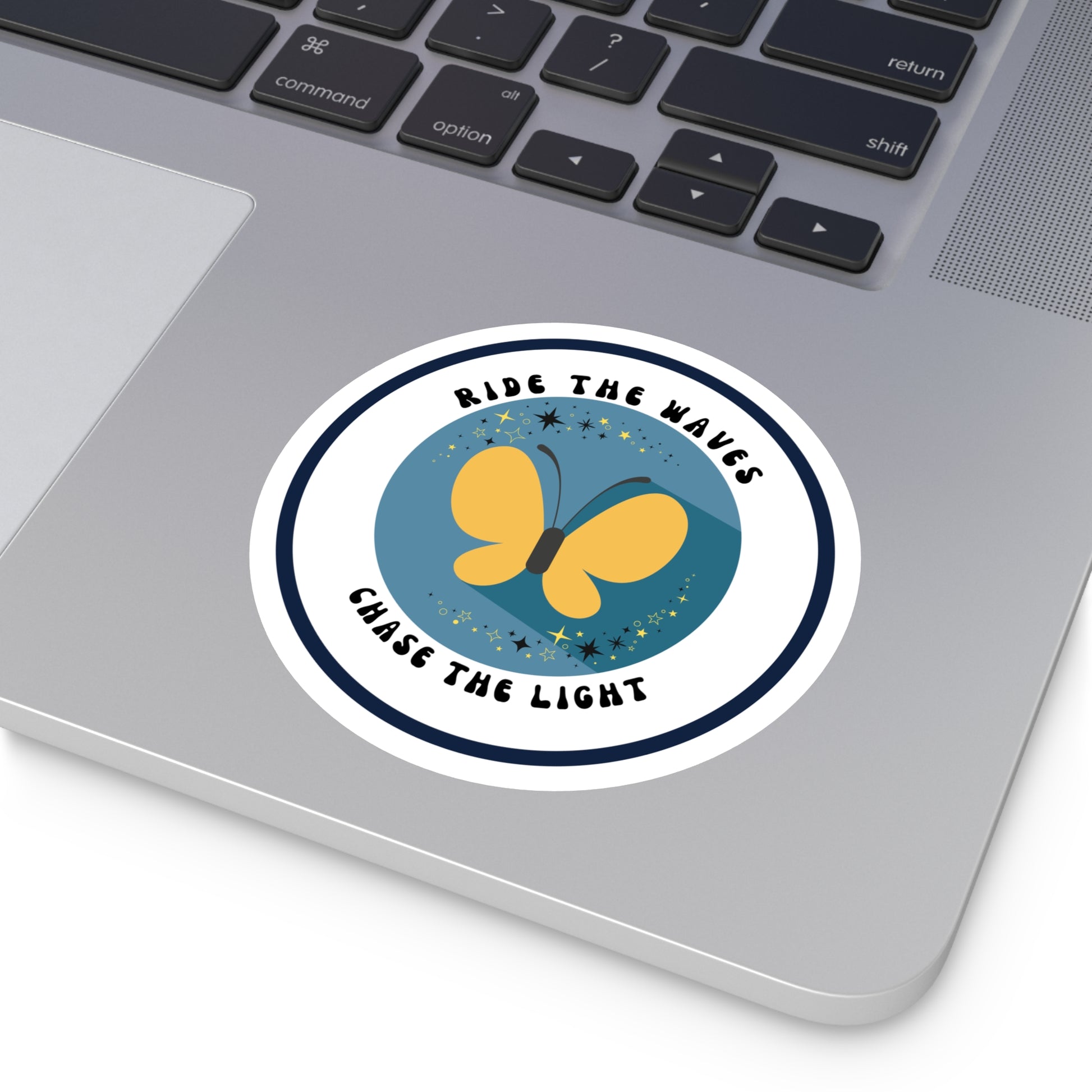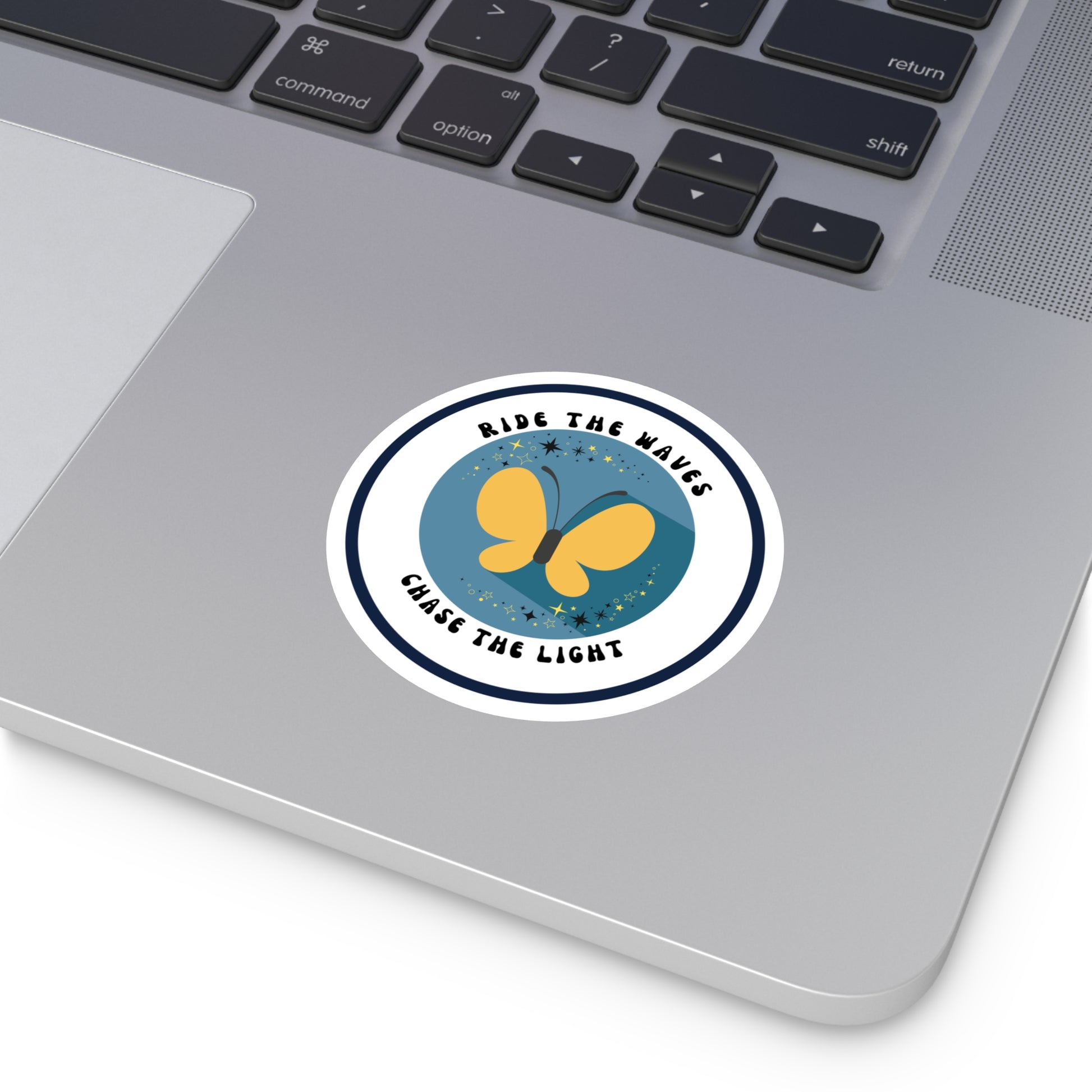 Ride the Waves, Chase the Light Sticker – Round Vinyl Ocean Butterfly Decal for Laptop, Journal & Water Bottle