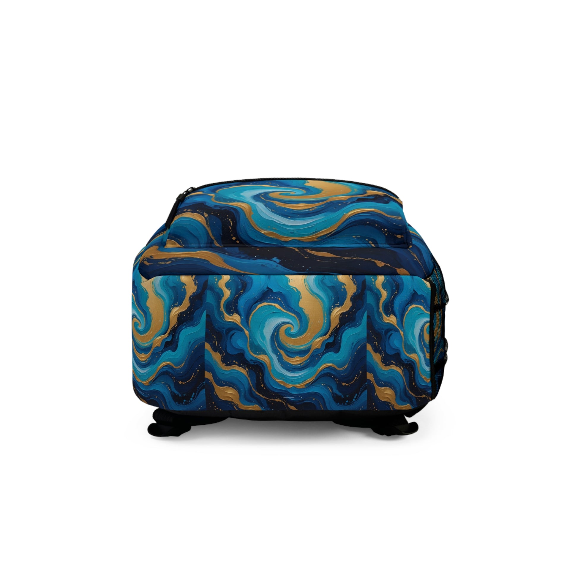 Tide Dreams Backpack – Celestial Swirl Print Bag, Blue and Gold Ocean-Inspired Daypack, Stardust Cove Travel Essential